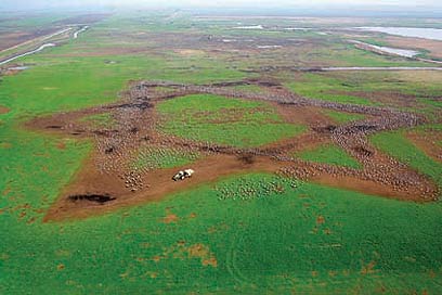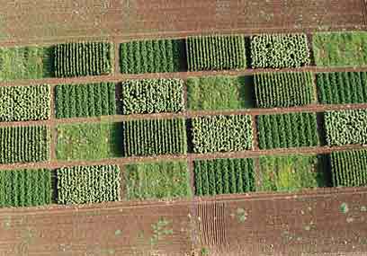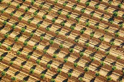 משבצות בירוק. ארבעה גידולי שדה טיפוסיים: אבטיח, עגבניות, חמניות ותירס שגדלים בחוות הנסיונות של עכו, נשקפו מהאוויר כמו מעשה טלאים של בריאות ירוקה.
