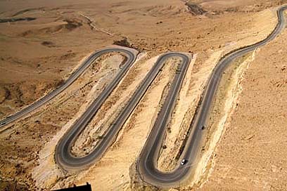 מעשה אדם ומעשה בראשית. בירידה הדרומית של מצפה רמון, לוקח אותנו הכביש במסלול תלול ומפותל אל עבר המדבר.