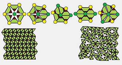 "הגיאומטריה פשוטה, יחסית", אומר ד"ר שוקף. "בשכבה המסולסלת, שנוצרת כתוצאה מתנועת החלקיקים מעלה ומטה, כל משולש שנוצר על-ידי שלושה חלקיקים סמוכים יהיה מעוות. במקום משולש שווה-צלעות (שהיה קיים אילו כל החלקיקים היו מוצבים במישור אחד), הם יוצרים משולשים שווי-שוקיים, שבהם רק שניים מהצדדים שווים - ולא כל השלושה. הסדרי ריצוף של משולשים שווי-צלעות ייראו אותו הדבר, לא משנה איך מניחים את המשולשים. אבל הרכבים שונים של משולשים שווי-שוקיים מניבים צורות שונות, ורק אחת או שתיים מתוך מיגוון הצורות האלה שימושית לאריזת חלקיקים באופן יעיל".