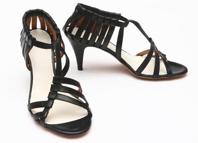 ההליכה בכיוון הקלאסי מאפיינת גם את הדגם המקסים של שני בר, שלא חששה להשאיר את החלק הקדמי של הסנדל בגזרת פיפ-טואו נקייה, ולטפל בעיקר ברצועות הקרסול – שתי רצועות דקיקות, שמטפסות מעלה בכמה סנטימטרים, ושחלקן הקדמי מעוצב בצורת פרפר מעוגל. גרסה נקייה אף יותר בלק בצבע גוף מציעה רשת נעלי בינגו, שבחרה בשלוש רצועות צנועות, אחת לקרסול, אחת לחלק הקדמי, ואחת שמחברת בין השתיים, ורק קורצת לגזרת הרומיות.