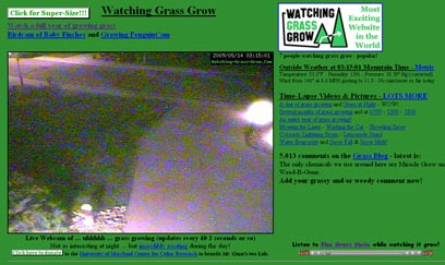 "זה כמו לצפות בעשב צומח", אומרים באנגלית על משהו משעמם במיוחד. אבל למה "כמו" אם אפשר לצפות בדבר האמיתי? בדיוק בשביל זה המציאו את האינטרנט. Watching Grass Grow הוא אתר מיותר לחלוטין שממחיש למה הביטוי הזה כל-כך מדוייק. הבעלים מספר שקנה מצלמת רשת והחליט להנציח את המדשאה שליד ביתו. התמונה ממצלמת הרשת מתעדכנת כל שתי שניות. לממהרים, יש גירסה מהירה שמסכמת את השנה שעברה ואת חילופי העונות כפי שהן נצפו דרך הדשא - והכל בדקה אחת. מרתק.