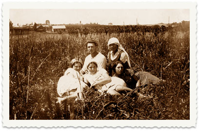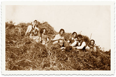 4. תארו לכם היום באמצע פתח תקווה ערמת חציר ועליה יושבת משפחת כצנלסון - ובכן, כך זה נראה בשנת 1929. מימין: ציפורה ויצחק כצנלסון, באמצע סטיציה, ג'יגה (גיסו של ברל) וחנה. משמאל: בנות כצנלסון, בת עמי ושרה.