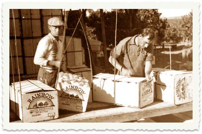 3. בעת קטיף תפוזים בפרדס ליד פתח תקווה, 1929. קבוצת נגרים עוסקת בסגירת ארגזי הפרי. היו אלו ארגזים מעץ ועליהם חותמת: Rainbow Jaffa Oranges Selected. את הפרי היו עוטפים בנייר ריחני וסוגרים את הארגזים עם קנים לחים (סרטי פלדה עוד לא היו בשימוש).