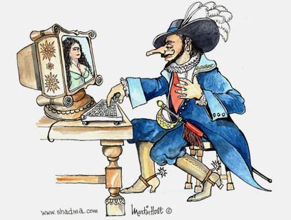 סיראנו דה ברז'ראק עלי מקלדת (איור: מרטין הולט, www.shadma.com)
