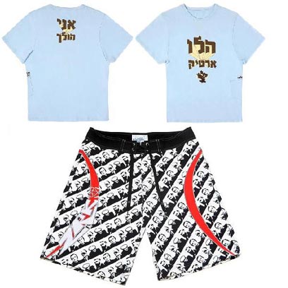 חולצת מוכר ארטיקים (מקדימה ומאחורה) ומכנסי גלישה עם מנהיגים ציוניים של "זרקא" (צילומים: טל טרי, גיא גלעד)