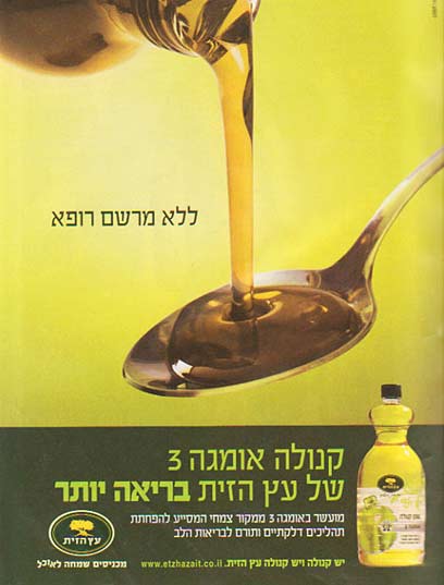 באחרונה החלה חברת "עץ הזית" לפרסם בעיתונות מודעה חדשה בה נראית כפית אליה נמזג השמן "קנולה אומגה" הנראה כתרופה לכל דבר. בנוסף מופיע הכיתוב "ללא מרשם רופא" והסבר על הסגולות הבריאותיות של המוצר: "מסייע להפחתת תהליכים דלקתיים ותורם לבריאות הלב". באופן זה ניסתה חברת הפרסום ליצור תדמית בריאותית ורפואית.