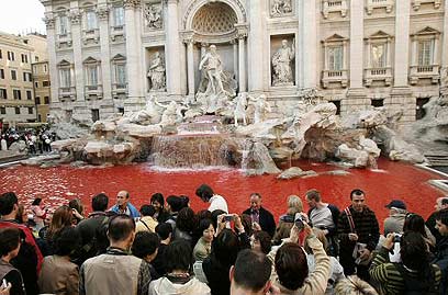 טרווי, המזרקה המפורסמת, צבועה באדום (צילום: רויטרס)