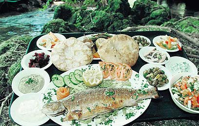 כיוון שהיינו רעבים מאוד, הזמנו מיד: פורל מטוגן בחמאה ופילה פורל על האש. עוד לפני הדגים הגיעה פלטה של סלטים: קערית של טחינה, תפוחי אדמה קטנים אפויים בתנור, סלט ירקות, ממרח פורל במיונז, זיתים דפוקים ולחם תוצרת בית. שום דבר לא מיוחד או מסעיר. אבל הכל חמים ונעים, במיוחד הלחם הריחני.