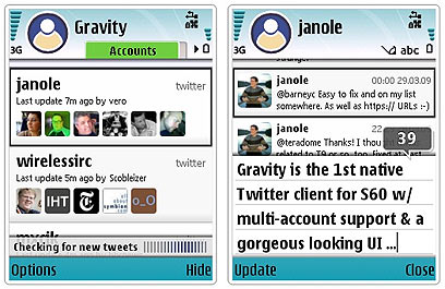 למכשירים המבוססים על מערכת ההפעלה S60 של סימביאן (בעיקר המכשירים המתקדמים של נוקיה) יש תוכנה בשם Gravity שעושה את העבודה מאוד טוב. החסרון: זה לא בחינם, היא עולה 10 דולר, אך ניתן להשתמש בה בנסיון למשך מספר ימים לפני שאתם מחליטים אם שווה לכם להשקיע סכום כזה בשביל לצייץ מכל מקום.