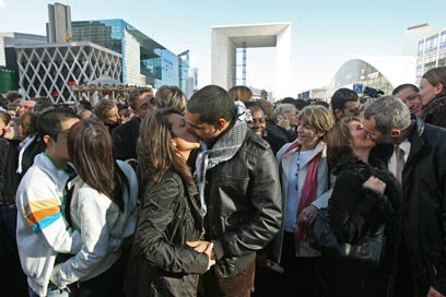 לא מנכסים לעצמם את הנשיקה "הצרפתית". מתנשקים בפריז (צילום: mct)