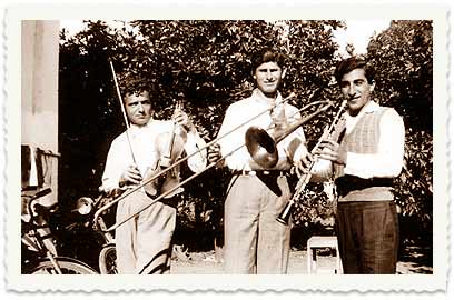 3. "בין העצים הירקרקים.." - טריו בעין גנים, פברואר 1939. מימין: יעקב כצנלסון, מיכאל (אברמוב) אברהמי ויאשיהו עמיצור.