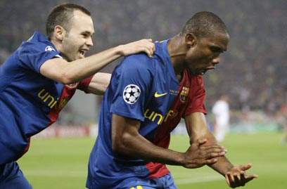 קבוצה גדולה עם דיפלומה: סמואל אטו וליאו מסי הובילו את בארסה ל-0:2 בגמר על מנצ'סטר יונייטד והביאו לה את הגביע השלישי בתולדותיה