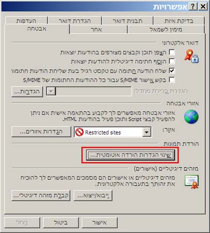 בשלב ראשון נכנסים לתפריט כלים / אפשרויות / אבטחה ומקליקים על הכפתור שינוי הגדרות הורדה אוטומטית.