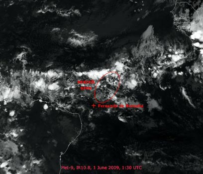 640 קילומטרים צפון-מזרחית לאיי פרננדו דה נורוניה, צפונית לברזיל. באזור זה נמצאו אתמול מושב של מטוס, כתם דלק ופיסות של שרידים לבנים מהמטוס. "סוג השרידים וריכוזם מוכיחים שמדובר בשרידי טיסה 447 של אייר פראנס", אישר היום דובר צבא צרפת. שר ההגנה של ברזיל אמר מוקדם יותר כי טרם נמצאו גופות וגם לא סימני חיים כלשהם.