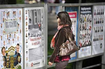 אישה פינית מול שלטי המפלגות המתמודדות, אתמול בהלסינקי (צילום: AP)