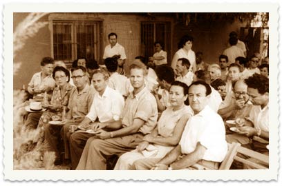 9. 1957, התכנסות עובדי השרות המטרואולוגי בקריה, במלאת 20 שנות עבודה לוותיקי השירות. בשורה הראשונה מימין: אברהם גרנובסקי, ? , גדעון שטייניץ (לימים מנהל השירות), צבי קראוטמר (משאבי אנוש), משה טלר (אחראי רשת התחנות, נפטר לא מזמן בן 93 בכפר גלעדי). בשורה השנייה בצד ימין נראה יעקב כצנלסון.