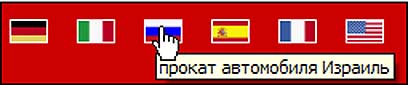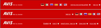 הדגלים שבבר העליון מפנים לעמודים בשפות שונות. באוויס עשו שימוש נכון ב-(tooltip) להציג הסבר ברור לגבי הקישור מכל דגל. יש לציין לטובה שמוצגים לא רק שם השפה, אלא גם הפונקציה של האתר: "השכרת רכב בישראל". בנוסף, ההסבר מוצג כראוי, בשפה הרלוונטית (ולא הכיתוב "לאתר באנגלית" כפי שמופיע לפעמים במקומותינו, שלא ממש עוזר למי שלא מבין עברית) . במעבר עכבר על דגל רוסיה, לדוגמה, מוצג: