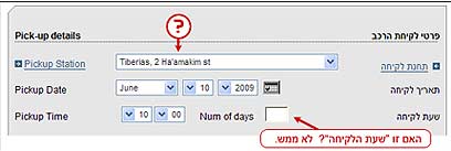 בעיית העברית-אנגלית ממשיכה גם בשאר הטופס – השדה שמוצג מול "שעת לקיחה" , לדוגמה, שנראה, באופן אינטואיטיבי כמקום המתאים להזין את שעת הלקיחה, מיועד בעצם להזנת מספר הימים.