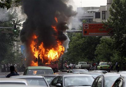 אוטובוס עולה באש בבירה טהרן, אתמול (צילום: AP)