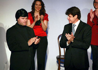 בלגוייביץ' לצד השחקן שמגלם אותו, ג'ואי בלנד (צילום: AFP)