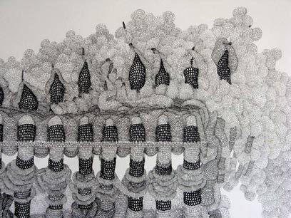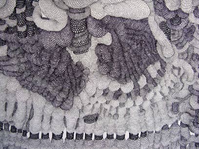 הם מצוירים בטושים פרמננטיים דקים על דפים המשתלשלים לרצפה. למעשה, הם נראים כמו מסכים סרוגים המשחזרים מבנים מורפולוגיים, תאי גוף וקישורי ד.נ.א. ניתן לראות בהם גם מבנים טופוגראפיים עם נגיעה ידנית, עליות ומורדות, בליטות ושקעים. ולמרות שכל לולאה נראית במקומה, קיימת הרגשה שבין רגע איזה קפיץ יכול להשתחרר - משהו ימשוך איזה חוט מתוך הציור והכל ייפרם.