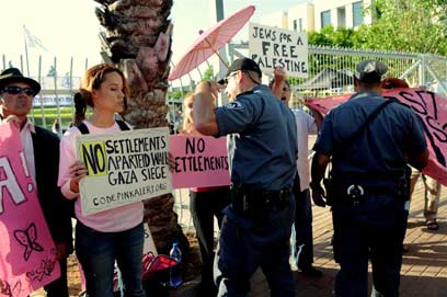 במקביל, גם פעילי שמאל, בניצוחו של יו"ר "שלום עכשיו" יריב אופנהיימר, פתחו בהפגנה בכניסה לקמפוס. המפגינים, חלקם לבושים בוורד, נשאו שלטים שעליהם נכתב: "לא להתנחלויות".