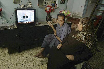 פלסטינים צופים בנאום בחאן-יונס (צילום: רויטרס)