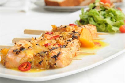 שיפודי סלמון בגריל במשרה מנגו, בוטנים ודבש