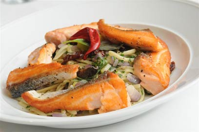 - מחממים מעט שמן זית במחבת כבדה וכשהוא חם מניחים עליו את נתחוני הסלמון עם העור פונה כלפי מטה. מקטינים את האש, בוזקים על הדג מלח ופלפל וממשיכים לטגן. כשצבעו של הדג הופך "אטום" - הוא מוכן. חשוב מאוד לא "להתעסק" עם הדג במחבת כי הוא יתפרק. כשהדג מבושל, מניחים אותו על הפסטה ומגישים מיד.