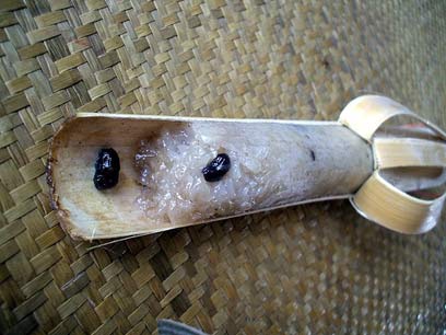 כשהכנת האורז הדביק הירוק מסתיימת נגו מתפנה לעזור ליאי טיט במלאכה המפרכת של הכנת קאנום טו (Tou), מעדן מופלא שרק בטעות לא טעמתי לפני הפגישה עם השתיים. כאילו כדי להכשיל את התמימים, יש קאנום שנראה דומה מאוד לקאנום טו, אבל הוא עשוי ממחית צמיגה של שעועית או טארו עם חלב קוקוס ומלח, ואותו אני לא מחבבת במיוחד. מאחר שחשדתי בקאנום טו שהוא קאנום פואק קואן (Puak kuan), ויתרתי עליו בלי לדעת מה אני מפסידה. קאנום טו עשוי מתערובת של קוקוס טרי מגורר, סוכר ושני סוגים של קמח אורז. הטעמים הבולטים הם הקוקוס וקמח האורז הקלוי, אבקה דקה עם ניחוח שמזכיר דברים טובים מהבית, כמו קקאו ואגוזים.