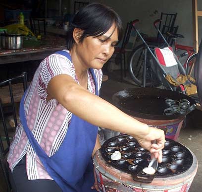 יאי טיט (62) גרה בשכונה שנראית קצת כמו כרם התימנים, שני מטר משוק הבוקר של העיר טראט (בדרום מזרח תאילנד). בתשע בבוקר אנחנו מחכות לבתה נגו (Ngo – שמו התאי של פרי הרמבוטן) בת ה-41, שתתעורר ותביא חומרי גלם מהחנות. נגו מגיעה ופורקת מהאופנוע קילוגרמים של סוכר, סוגים שונים של קמח אורז, שקיות עם חלב קוקוס טרי ושק של אורז דביק. כל הבישולים מתבצעים בחזית הבית, ממש על שפת המדרכה. אין כיור ואין שולחן, יש רק שרפרפים וכסאות פלסטיק, שתי גזיות גדולות, ברז מים וגיגיות לשטיפת הכלים.