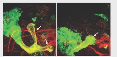 תאי עצב נורמליים ומוטנטים במוח גולם בן 24 שעות של זבוב-פירות. במוח הנורמלי (מימין) האקסונים עוברים גיזום בנקודה (המסומנת בחץ) בה האקסון הראשי מתפצל לשניים. במוח המוטנטי (משמאל), המוטציה מונעת את הגיזום, כך שהאקסונים (מסומנים בחיצים) נשארו שלמים גם לאחר נקודת הפיצול