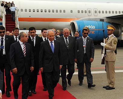פרס לאחר נחיתתו בבאקו. חוששים מהשכנה (צילום: עמוס בן גרשום, לע"מ)