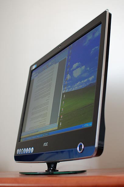 המסך מוצא מהקרטון בשני חלקים. בסיס המסך עשוי זכוכית (כבר מזמן לא נתקלנו בשימוש בזכוכית במסכי מחשב) והוא מתחבר אל גוף המסך בעזרת בורג בעל סוגר מחובר. חזית המסך שחורה, שולי המסגרת עשויים פלסטיק שקוף. הפס התחתון של המסגרת גם הוא שקוף, אבל הפעם בגוון כחול ובצד ימין של פס זה מואר עיגול (לחצן הפעלה) בכחול זוהר, מסביבו טבעת כסופה.חיפוש אחר לחצני השליטה / תפריטים לא מוצא אותם בשום מיקום על המסגרת, והם מתגלים לבסוף על הלחצן הכחול הגדול שמצוייר עליו סמל הפעלה / כיבוי. לחיצה עליו מכניסה את המשתמש אל התפריט. הטבעת המקיפה או הלחצן משמשת כבורר בחירה בעל ארבעה כיוונים, כשלחיצה עליה מרגישה כמו משהו זול ופלסטיקי למגע.
