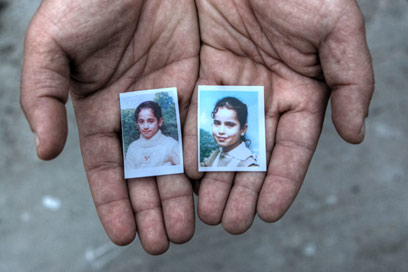 מוחמד חבש אוחז בתמונות בתו שזא ואחייניתו אסרא שנהרגו מפגיעת מל"ט