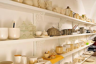 לצד כלי חרס חשופים במראה כפרי, נחות צלחות קרמיקה מעודנות בדוגמת תחרה ואוסף כלי אוכל עתיקים. כולם משתלבים יחד בחנות קטנה ומסוגננת, המתחבאת בסמטה יפואית