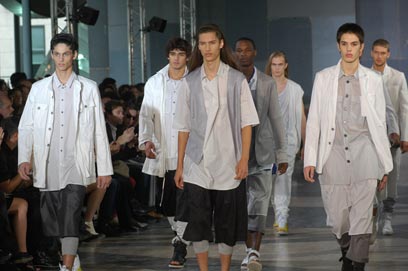 דמיר דומה, מעצב צעיר ממוצא קרואטי שגדל בגרמניה, נחשב לכוכב עולה בעולם האופנה הגברי. בגדיו, בעלי הצללית הרכה והרחבה, בסגנון מעט מזרחי, דחקו הצידה את הצללית הדקיקה ששלטה לאחרונה במלתחה הגברית בהשראת היידי סלימן, מעצב בית דיור לשעבר. מאחורי הקלעים הסביר לי דומה מה חדש ומיוחד בקולקציה שלו לקיץ הבא: "בתצוגה לקיץ הבא אני ממשיך ברעיונות שהצגתי בעבר הקשורים בחקר הצללית הגברית. גם בתצוגה הזו רוב הדגמים רחוקים מהגוף, זורמים ומפיצים אווירה מלנכולית, אבל יש לי גם כמה חידושים. לצבעים לבן, שחור ואפור ששלטו בקולקציות העבר שלי הוספתי את הצבע האדום וכן דגמים עם הדפסים. אני גם מציג גזרה חדשה של מכנסיים". הקולקציה של דומה משחררת את הגברים מתדמית הגולדן בוי ומשדרת אנטי לזוהר. יש בה רכות, נוחות ותחושת שלווה. מלתחה אידיאלית לחשבון הנפש של מפוטרי ההיי טק.