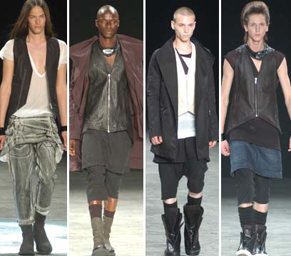מעודד מההצלחה לה זכתה קולקציית הנשים שלו, הציג האמריקאי תושב פריז ריק אוונס קולקציית גברים ראשונה באולם המשמש לאימוני אגרוף. לבגדי הגברים שלו גזרות אלכסוניות ומבנה גיאומטרי בסגנון רוק פאנקי. תוספות של בד רשת חשפו מדי פעם חלקים מגוף הדוגמנים, והתוצאה הצליחה לשמר את סגנונו הייחודי של אוונס גם במסגרת הגברית.