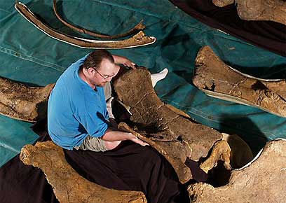סקוט האקנל עם המאובנים של אחד הדינוזאורים (צילום: רויטרס)