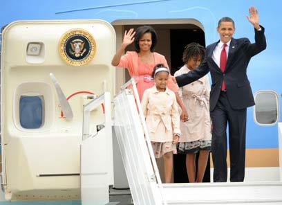 משפחת אובמה בהרכב מלא, עם נחיתתה במוסקבה (צילום: AFP)