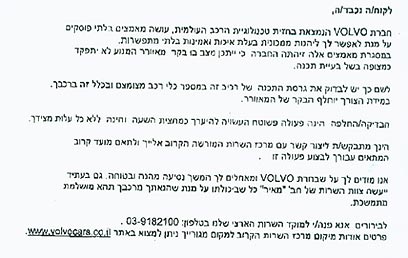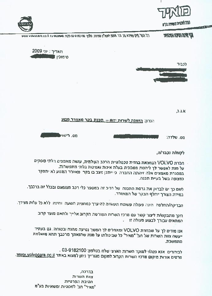 לקוחות שבבעלותם XC70 וקיבלו מכתב הקורא להם להגיע למוסך, או שמעוניינים לבדוק אם מכוניתם נכללת בקריאה לתיקון, יכולים להתקשר למוקד החברה, שמספרו 03-9182100.