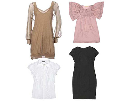 נכון בשבילך, מימין למעלה על כיוון השעון: טוניקה של "דליתי", שמלה שחורה של "זארה", חולצה מכופתרת של "TAGWOMAN", טוניקה מוזהבת של סיגל דקל (צילומים: ניר יפה)