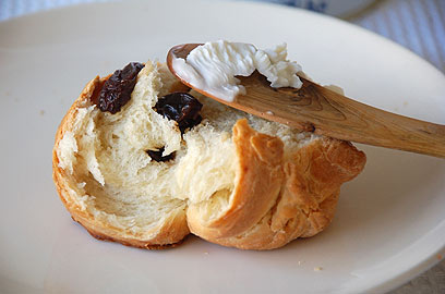 - מוציאים אוויר מן הבצק, מוסיפים צימוקים ומטמיעים אותם בבצק.