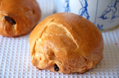 רצוי להכין את הלחמניות הללו עם צימוקים כהים קטנים: כיוון שלא השגתי כאלה הכנתי את הלחמניות עם צימוקים כהים גדולים. חשוב להקפיד על כך שלא יבלטו צימוקים בחלקה העליון/החיצוני של הלחמניה, משום שהם יישרפו באפייה.