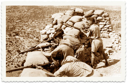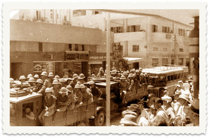 12. בשנת 1936 פורצים מאורעות דמים בא"י. בתצלום: שוטרים בריטים כנגד פורעים ערבים.