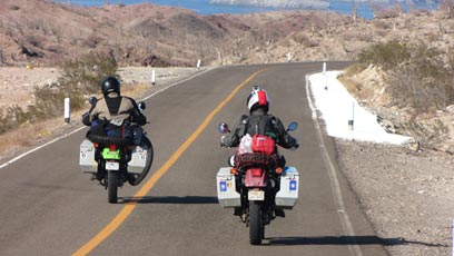 לפני שיצאתי למעבר הגבול חיפשתי שותפים לקטע הראשון במקסיקו. שמתי בקשה בכמה פורומים, מישהו אכן ענה לי אבל כבר יצאתי לדרך. היו אלה שני בלגים צעירים על שני אופנועי קאווסאקי 650, אולי סוג האופנוע הפופולרי ביותר בקרב מי שיורד לחצות את אמריקה הלטינית. פגשתי אותם לאחר היציאה מסנטו תומאס, יושבים במסעדת אוטובוס. סטאן, בן 23, ויורי, בן 26, מעיירה ליד בריסל. החלטנו לרכוב את היום הזה ביחד. להם היו תכניות אחרות להמשך. כולל רכיבת שטח ממש, שהחלטתי מראש שבטיול הזה אמנע מכך. קבענו כללי רכיבה משותפת ופנינו לכיוון חוף באהייה-דה-לוס-אנחלס במרכז הצד המערבי של חצי האי באחה. נכנסנו יחד למדבר. שיחי קקטוס ענקיים כיסו את צידי הדרך. הנוף היה גבעי ובצבעי חום-צהוב. הכל היה ראשוני, מחוספס ופראי. חלק גדול מהסלעים היפים בצדדים היו מכוסים בכתובות גרפיטי. עוד משהו להפנים על מקסיקו ותרבותה.
