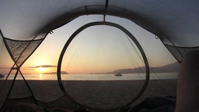 ישראל-ארתורו, מקסיקני כבן ארבעים, ששלף לפני תעודה המוכיחה כי זה שמו, התרגש למשמע היותי ישראלי, הזמין אותי לבירה והמליץ לי לבחור בצד הימני של החוף להקמת האוהל, זה הצד השקט יותר בלילה, כי נוהגות להגיע לכאן חבורות של צעירים שמבלגנים ועושים רעש. הבנתי. לאחר שהחשיך, נסגרו דוכני האוכל והנופשים נסעו, הקמתי את האוהל במרחק כ-10 מטר מקו המים ומלהקת השקנאים שפטרלה הלוך ושוב מולי. הייתי כמעט לבד. כיסיתי את האופנוע והשתרעתי באנחה רוגעת. מעט אחרי חצות החלה להשתולל במקום סופת רוח וחול בעוצמה. האוהל התרומם מעלי כמו איזה מצנח רחיפה והאופנוע הוטח לחול. יצאתי בזחילה, מנער את החול משערי ואזני. עכשיו לך תרים אופנוע לבד באמצע סופת חול.