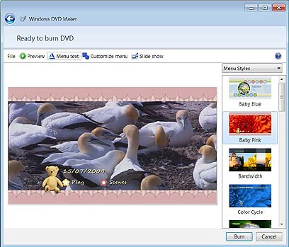 ואם כבר דברנו על צריבת תקליטורים, חייבים להזכיר את הכלי החדש לצריבה שנכלל עם Windows 7 ושמו Windows DVD Maker. האשף הזה יאפשר לכם ליצור בקלות תקליטורים מרשימים - כולל תפריט ניווט, בדיוק כמו ב-DVD מקצועי.