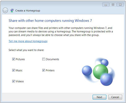 ה-HomeGroup היא אולי אחת התכונות הכי מגניבות של Windows 7 וכזו שמשתתפי התחרות הזכירו לא מעט. זוכרים שהייתם צריכים להסתבך עם הגדרות כדי ליצור קבוצה אחת לכל המחשבים ברשת הביתי שלכם, והייתם נאבקים עם ההגדרות? לא עוד. HomeGroup היא הדרך הקלה יותר. הפעילו את האשף שנמצא תחת לוח הבקרה, לחצו על האפשרות להצטרף או ליצור HomeGroup חדשה, בחרו איזה סוגי מדיה אתם רוצים לשתף ולחצו על Next (הבא).