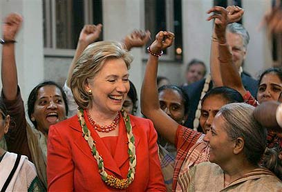נשים הודיות מקבלות את פניה של קלינטון (צילום: AP)